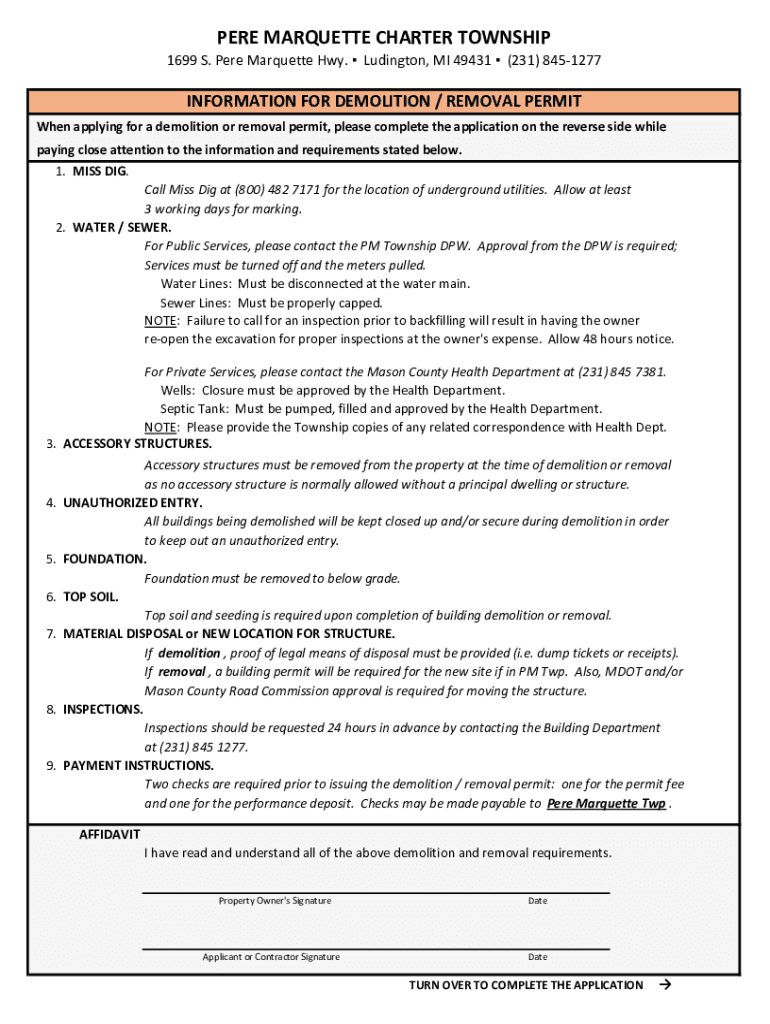 Père MARQUETTE CHARTER TOWNSHIP 1699 S. Père Marquette Hwy. Ludington, MI 49431 (231) 8451277INFORMATION FOR DEMOLITION / REMOVAL PERMIT When applying for a demolition or removal permit, please