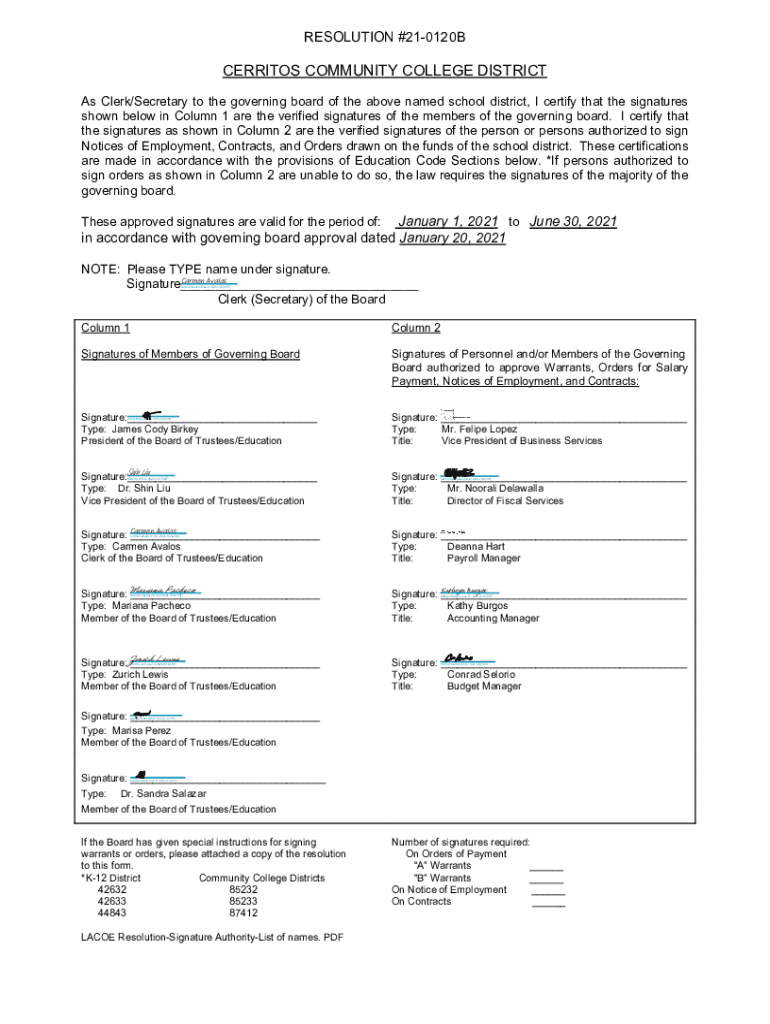 RESOLUTION #210120BCERRITOS COMMUNITY COLLEGE DISTRICT As Clerk/Secretary to the governing board of the above named school district, I certify that the signatures shown below in Column 1 are the verified
