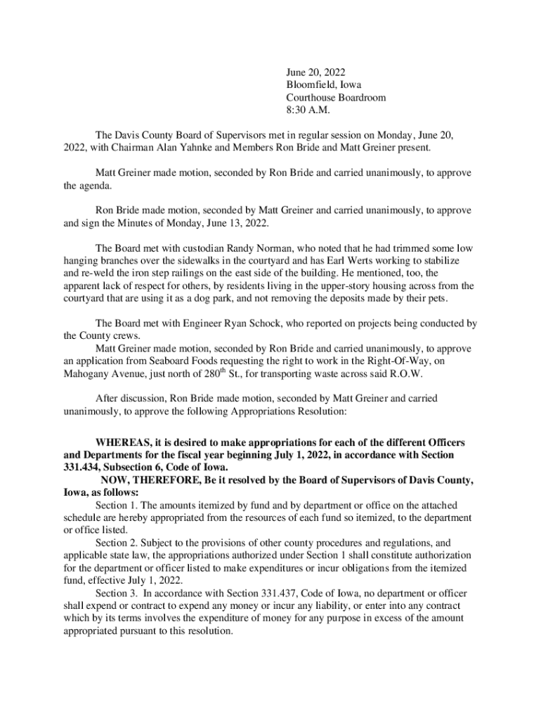 June 20, 2022, Bloomfield, Iowa Courthouse Boardroom 8:30 A.M. The Davis County Board of Supervisors met in regular session on Monday, June 20, 2022, with Chairman Alan Yankee and Members Ron Bride