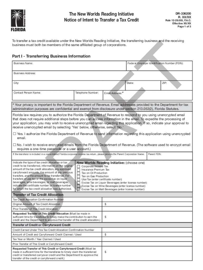 The New Worlds Reading Initiative Notice of Intent to Transfer a Tax CreditDR336200 R. XX/Rule 1229.003, F.A.C. Effective XX/XX Page 1 of 3To transfer a tax credit available under the New Worlds Reading