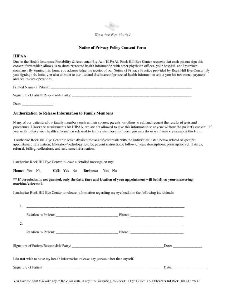 Notice of Privacy Policy Consent Form HIPAA Due to the Health Insurance Portability & Accountability Act (HIPAA), Rock Hill Eye Center requests that each patient sign this consent form which allows