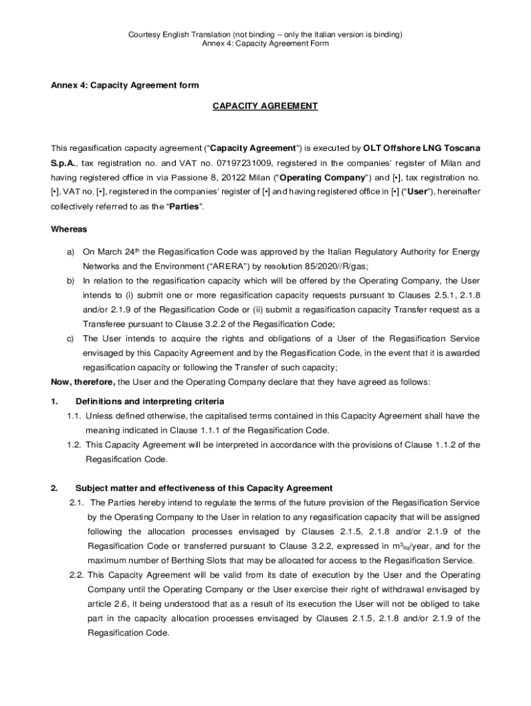 Courtesy English Translation (not binding only the Italian version is binding) Annex 4: Capacity Agreement Formatted 4: Capacity Agreement form CAPACITY Agreements ratification capacity agreement