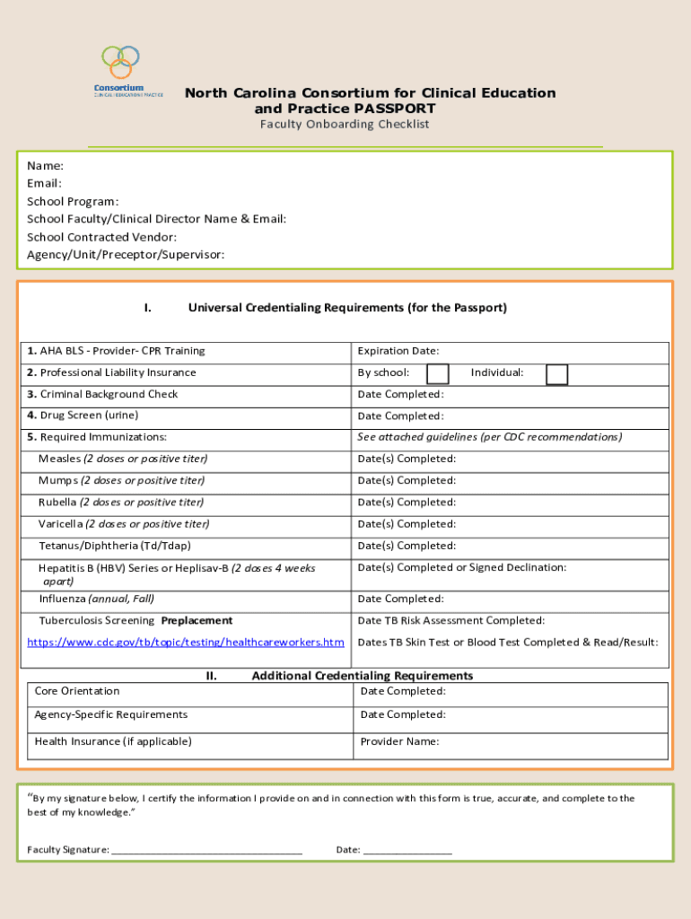 North Carolina Consortium for Clinical Education and Practice PASSPORT Faculty Onboarding Checklist Name: Email: School Program: School Faculty/Clinical Director Name & Email: School Contracted Vendor: