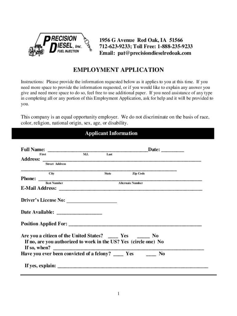 1956 G Avenue Red Oak, IA 51566 7126239233; Toll Free: 18882359233 Email: pat@precisiondieselredoak.comEMPLOYMENT APPLICATION Instructions: Please provide the information requested below as it applies