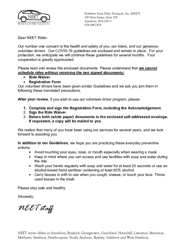 Northern Essex Elder Transport, Inc. (MEET) 100 Main Street, Suite 108 Amesbury, MA 01913 9783887474Dear MEET Rider: Our number one concern is the health and safety of you, our riders, and our generous