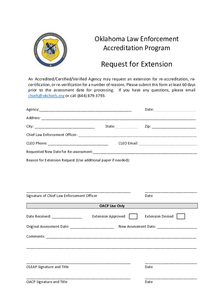 Oklahoma Law Enforcement Accreditation ProgramRequest for Extension An Accredited/Certified/Verified Agency may request an extension for reaccreditation, recertification, or reverification for a number