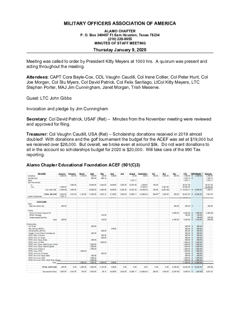 MILITARY OFFICERS ASSOCIATION OF AMERICA ALAMO CHAPTER P. O. Box 340497 Ft Sam Houston, Texas 78234 (210) 2289955 MINUTES OF STAFF MEETING Thursday, January 9, 2020, Meeting was called to order by