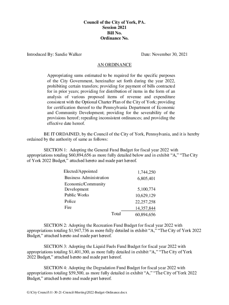 Council of the City of York, PA. Session 2021 Bill No. Ordinance No. Introduced By: Sadie Alternate: November 30, 2021, AN ORDINANCEAppropriating sums estimated to be required for the specific purposes