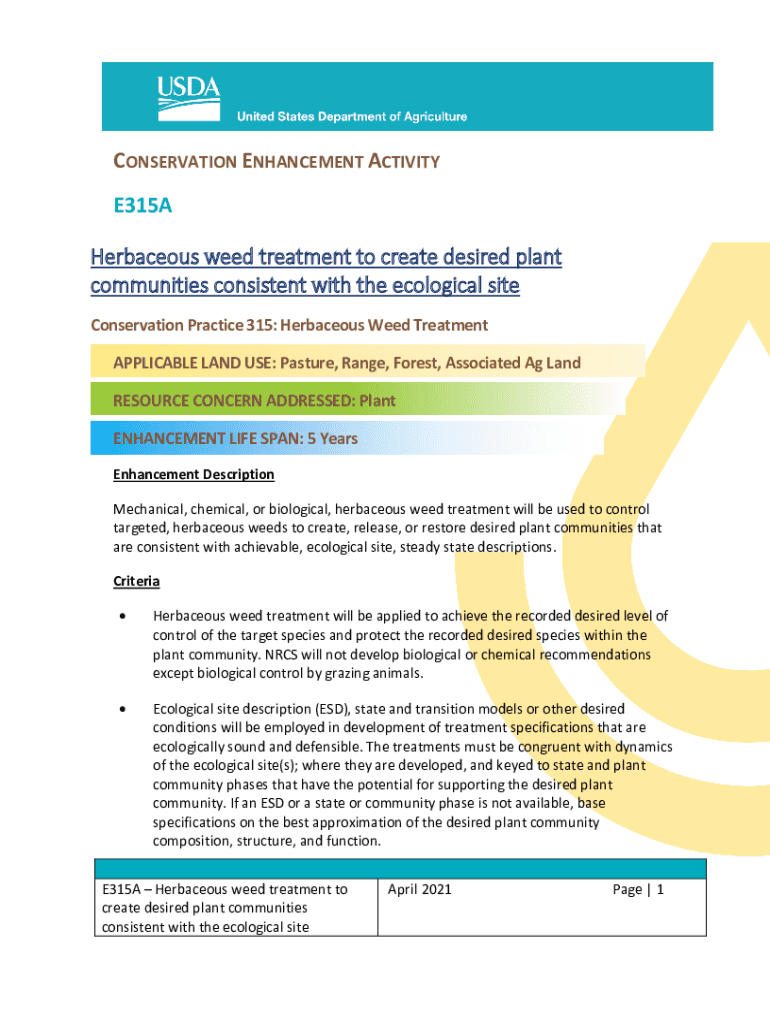 CONSERVATION ENHANCEMENT ACTIVITY E315A Herbaceous weed treatment to create desired plant communities consistent with the ecological site Conservation Practice 315: Herbaceous Weed Treatment APPLICABLE