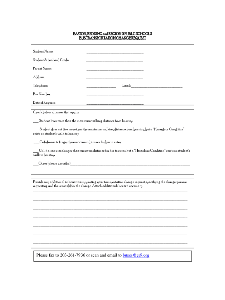 EASTON, REDDING and REGION 9 PUBLIC SCHOOLS BUS TRANSPORTATION CHANGE REQUEST Student Name:___Student School and Grade:___Parent Name:___Address:___Telephone:___Bus Number:___Date of Request:___Email:___Check