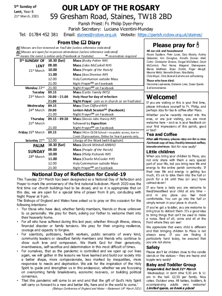 5th Sunday of Lent, Year B21st March, 2021OUR LADY OF THE ROSARY 59 Gresham Road, Stained, TW18 2BDTel: 01784 452 381Parish Priest: Fr. Philip Dyer Perry Parish Secretary: Luciana VicentiniMunday