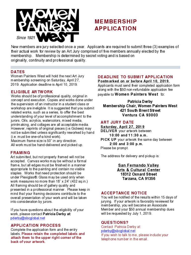 MEMBERSHIP APPLICATION INFORMATION New members are jury selected once a year. Applicants are required to submit three (3) examples of their actual work for review by an Art Jury comprised of five