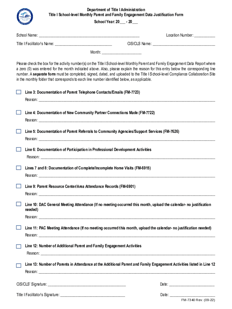 Title I School level Monthly Parent and Family Engagement Data Justification Formulae Preschool Year: 20___ 20___