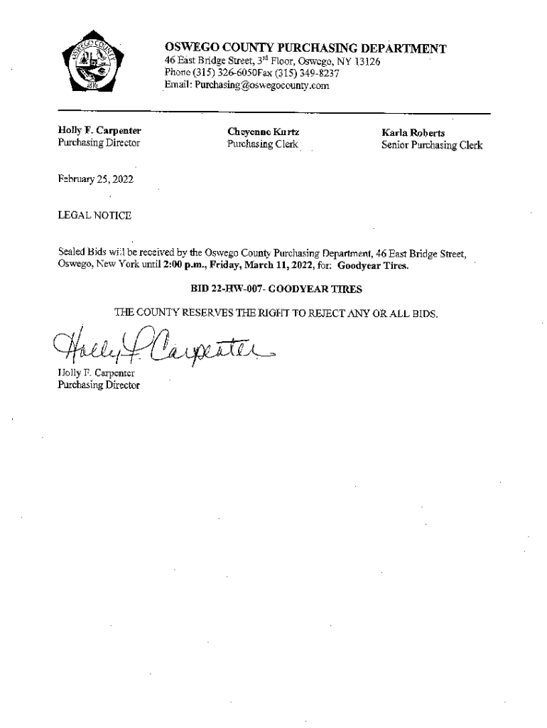 BID OSW22HW007 1. PART 1 INFORMATION FOR Vendors County of Oswego Highway Department is soliciting bids from qualified firms for Goodyear Tires for various highway departments. 1.1. DEADLINE, RECEIPT