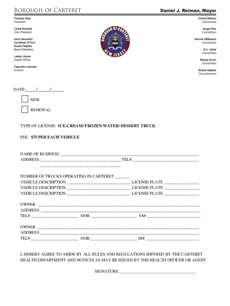 DATE:___/___/___ NEW RENEWALTYPE OF LICENSE: CREAM/ FROZEN WATER/ DESSERT TRUCK FEE: $75 PER EACH VEHICLENAME OF BUSINESS ___ ADDRESS ___ TEL# ___ ___ NUMBER OF TRUCKS OPERATING IN CARTERET ___ VEHICLE