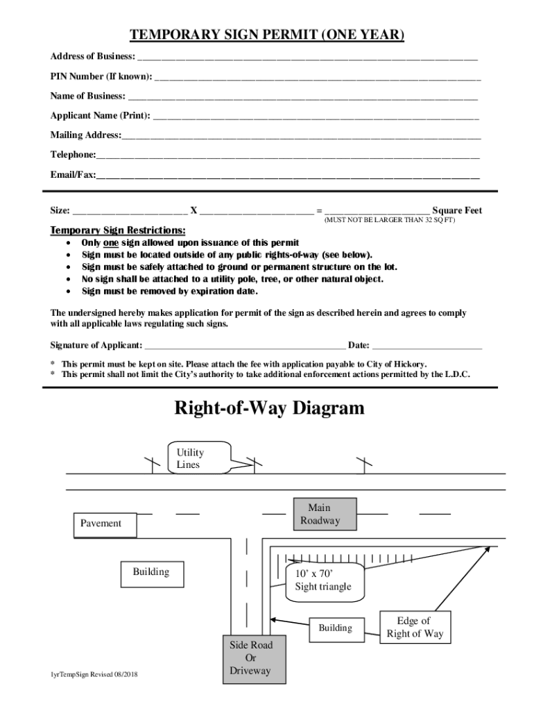 TEMPORARY SIGN PERMIT (ONE YEAR) Address of Business: ___ PIN (If known): ___ Name of Business: ___ Applicant Name (Print): ___ Mailing Address:___ Telephone:___ Email/Fax:___Size: ___ X ___ ___ Square