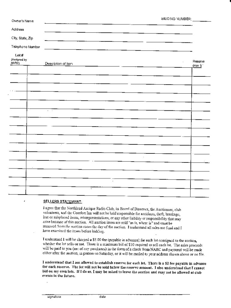 BIDDING NUMBER:Owner\'s Name Address City, State, Telephone Number Lot # (Assigned sellers STATEMENT;I age that the_ Northland Antique Radio Club, its Board directors, the Auctioneer, club vol, steers,