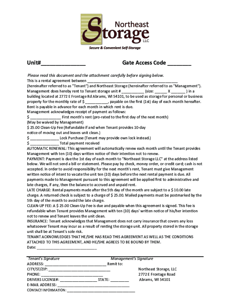 Unit#___Gate Access Code ___Please read this document and the attachment carefully before signing below. This is a rental agreement between ___ (hereinafter referred to as \” Tenant\”) and Northeast