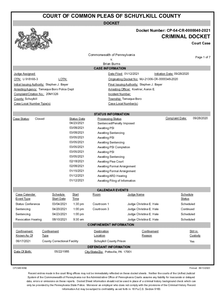 COURT OF COMMON PLEAS OF SCHUYLKILL COUNTY DOCKET Number: CP54CR00000402021CRIMINAL DOCKET Court Case Commonwealth of Pennsylvania v. Brian Burns CASE INFORMATION Page 1 of 7Date Filed: 01/12/2021Judge