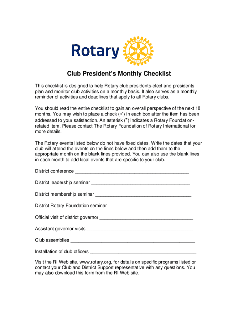 Club Presidents Monthly Checklist This checklist is designed to help Rotary club president select and presidents plan and monitor club activities on a monthly basis. It also serves as a monthly reminder