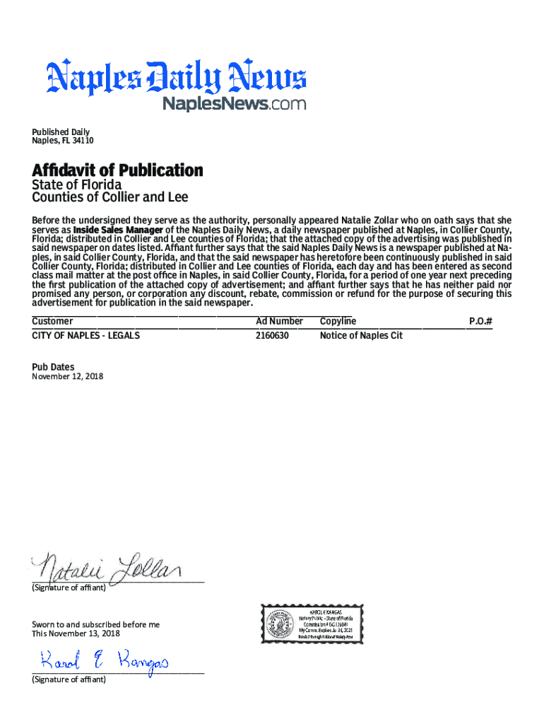 Published Daily Naples, FL 34110Affidavit of Publication State of Florida Counties of Collier and Before the undersigned they serve as the authority, personally appeared Natalie Dollar who on oath