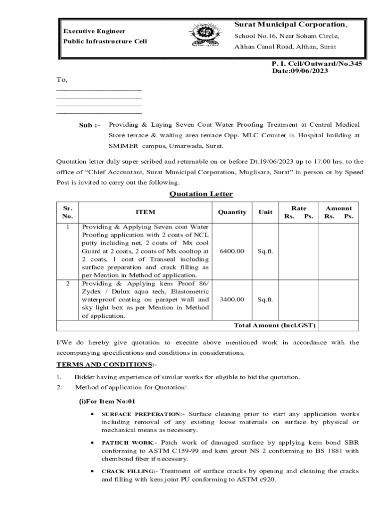 Surat Municipal Corporation, Executive EngineerSchool No.16, Near Sham Circle, Public Infrastructure Callahan Canal Road, Altman, Surat. I. Cell/Outward/No.345 Date:09/06/2023 To, ___ ___ ___ ___