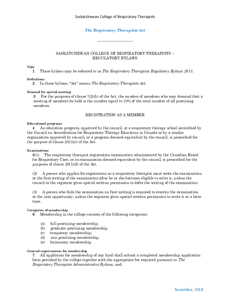 Saskatchewan College of Respiratory Therapists The Respiratory Therapists Act ___ SASKATCHEWAN COLLEGE OF RESPIRATORY THERAPISTS REGULATORY BYLAWS Title1These bylaws may be referred to as The Respiratory