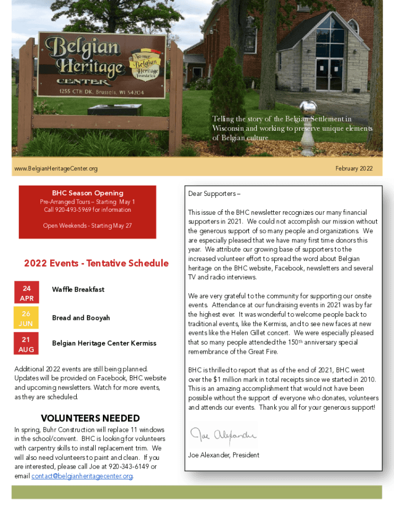 WWW. BelgianHeritageCenter.org February 2022BHC Season OpeningPreArranged Tours Starting May 1 Call 9204935969 for information Open Weekends Starting May 272022 Events Tentative Schedule 24 Airway