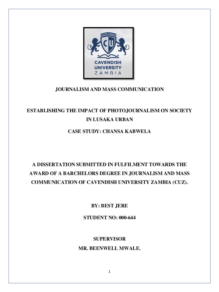 JOURNALISM AND MASS COMMUNICATIONESTABLISHING THE IMPACT OF PHOTOJOURNALISM ON SOCIETY IN LUSAKA URBAN CASE STUDY: CHANGE KABBALAH DISSERTATION SUBMITTED IN Fulfillment TOWARDS THE AWARD OF A BACHELORS