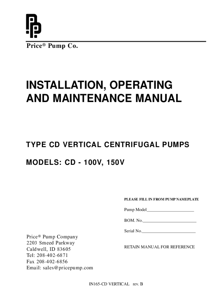 Price Pump Co. INSTALLATION, OPERATING AND MAINTENANCE MANUALLY CD VERTICAL CENTRIFUGAL PUMPS MODELS: CD 100V, 150VPLEASE FILL IN FROM PUMP NAMEPLATEPump Model___ BOM. No.___ Serial No.___Price Pump