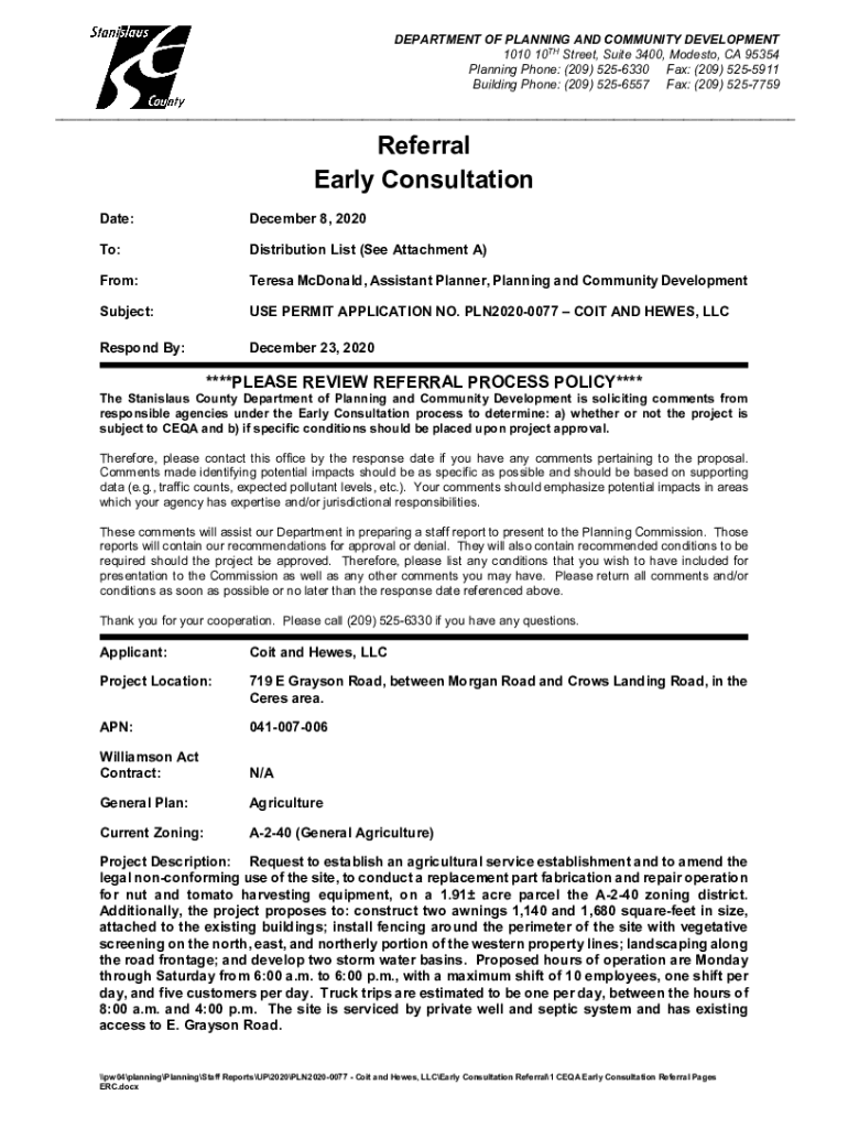 DEPARTMENT OF PLANNING AND COMMUNITY DEVELOPMENT 1010 10TH Street, Suite 3400, Modesto, CA 95354 Planning Phone: (209) 5256330 Fax: (209) 5255911 Building Phone: (209) 5256557 Fax: (209) 5257759 ___Referral