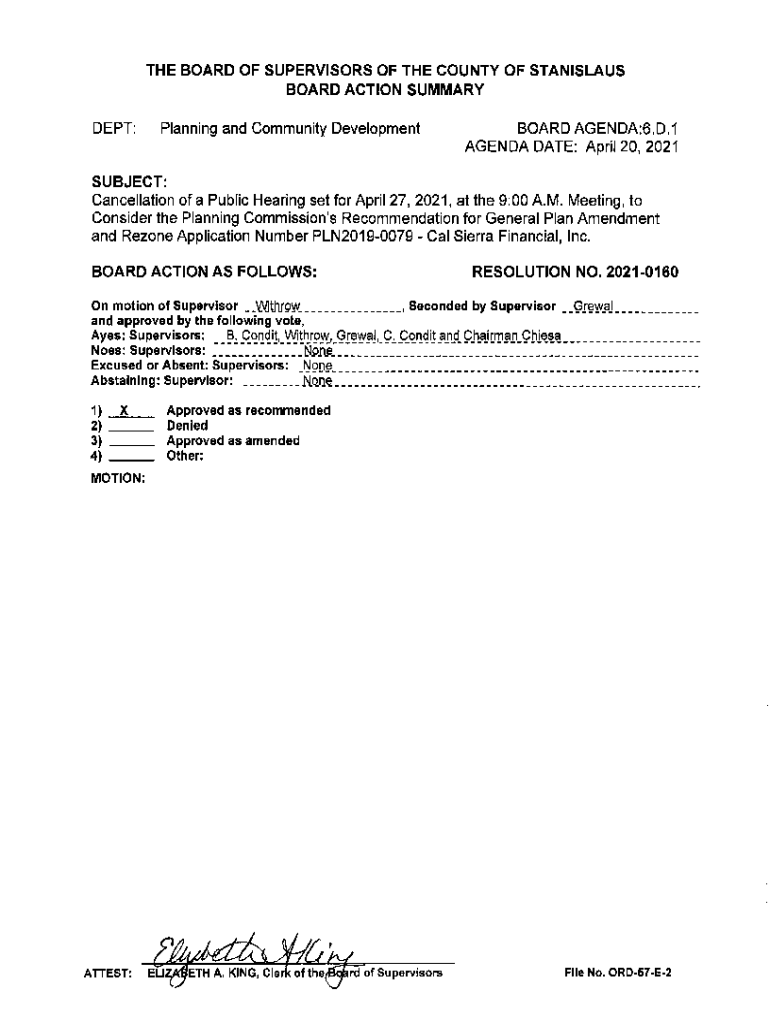 THE BOARD OF SUPERVISORS OF THE COUNTY OF STANISLAUS BOARD ACTION SUMMARYDEPT:Planning and Community DevelopmentBOARD AGENDA:6. D.1 AGENDA DATE: April 20, 2021SUBJECT: Cancellation of a Public Hearing