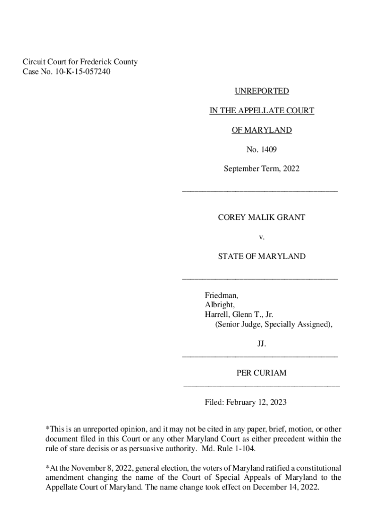 Circuit Court for Frederick County Case No. 10K15057240 UNREPORTED IN THE APPELLATE COURT OF MARYLAND No. 1409 September Term, 2022 ___COREY MALIK GRANT v. STATE OF MARYLAND ___ Friedman, Albright,