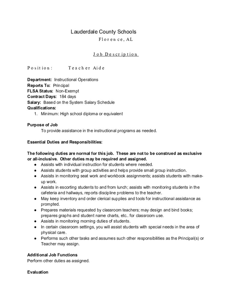 Lauderdale County Schools F l o r e n c e, AL J o b De s CR IP t ion P o s it ion :T e a c h e r Ai d department: Instructional Operations Reports To: Principal FLEA Status: Nonexempt Contract Days: