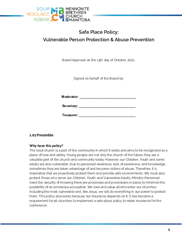 Safe Place Policy: Vulnerable Person Protection & Abuse PreventionBoard Approval on the 13th day of October 2021. Signed on behalf of the Board by:Moderator: ___ Secretary: ___ Treasurer: ___1.01