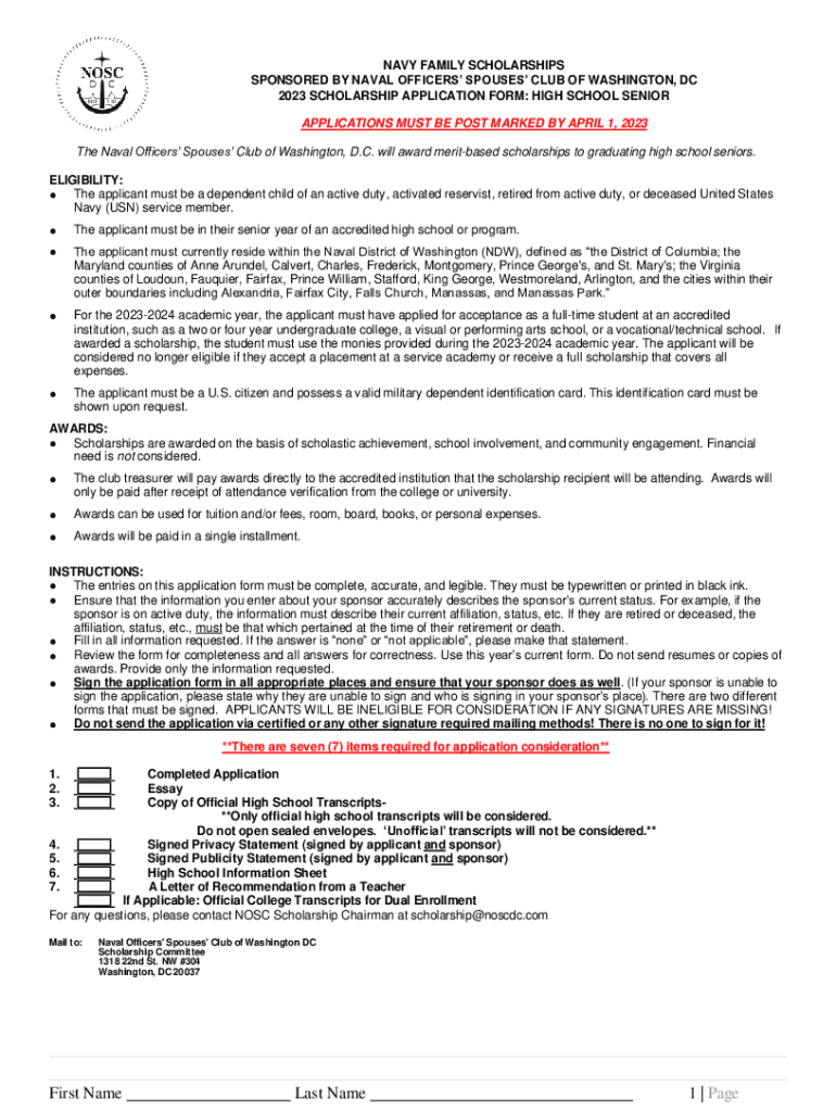 NAVY FAMILY SCHOLARSHIPS SPONSORED BY NAVAL OFFICERS SPOUSES CLUB OF WASHINGTON, DC 2023 SCHOLARSHIP APPLICATION FORM: HIGH SCHOOL SENIOR APPLICATIONS MUST BE POST MARKED BY APRIL 1, 2023, The Naval