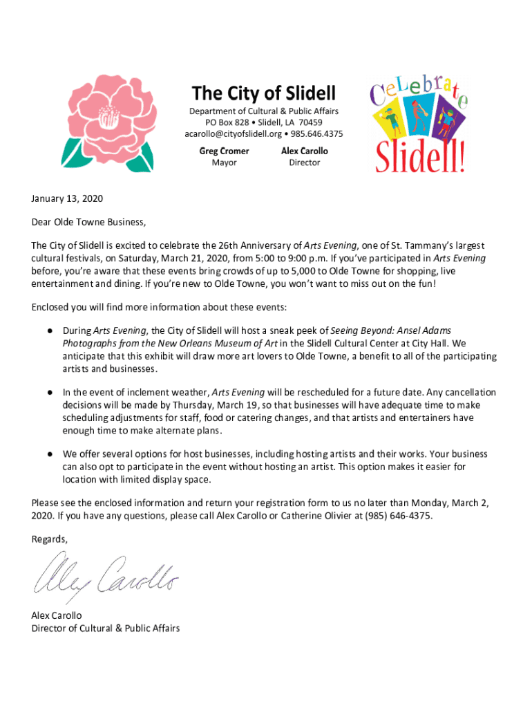January 13, 2020, Dear Old Town Business, The City of Slidell is excited to celebrate the 26th Anniversary of Arts Evening, one of St. Tammany's largest cultural festivals, on Saturday, March 21,