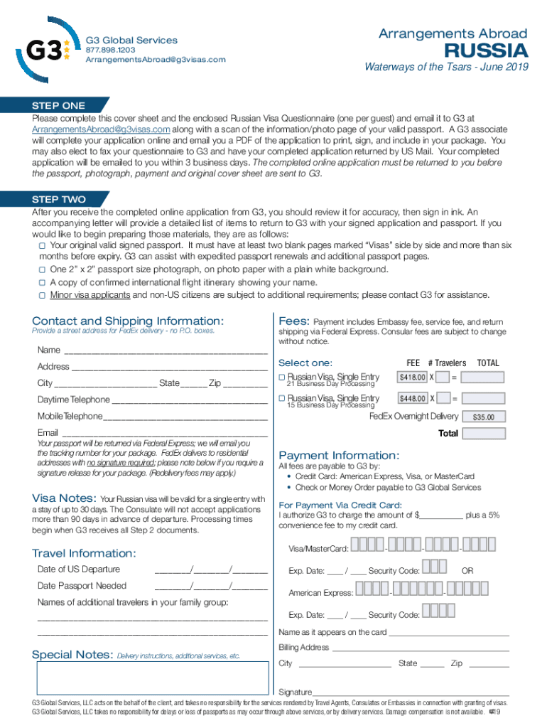 IMPORTANT VISA INFORMATION FOR THOSE USING G3 GLOBAL SERVICES Dear Traveler, As you prepare for your upcoming tour with Arrangements Abroad, we would like to remind you that a visa is required for