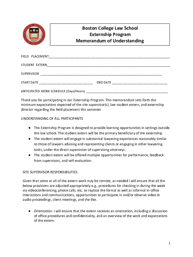 Boston College Law School Externship Program Memorandum of Understanding FIELD PLACEMENT___ STUDENT EASTERN___ SUPERVISOR ___ START DATE ___END DATE ___ANTICIPATED WORK SCHEDULE (Days/Hours) ___Thank