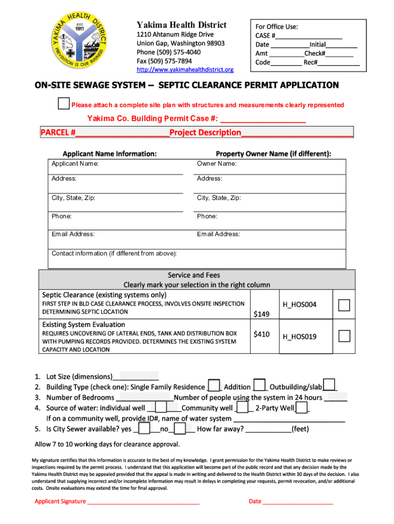 Yakima Health DistrictPlease attach a complete site plan with structures and measurements clearly represented Yakima Co. Building Permit Case #: ___Applicant Name:Owner Name:Address:Address:City,
