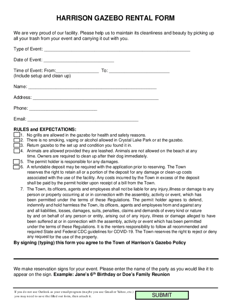 To fill out the harrison gazebo rental form, you need to provide your contact information, desired rental dates, and any additional requests.
