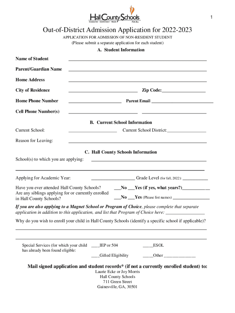 1OutofDistrict Admission Application for 20222023 APPLICATION FOR ADMISSION OF NONRESIDENT STUDENT(Please submit a separate application for each student)A. Student Information Name of Student___Parent/Guardian