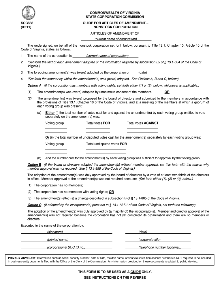 COMMONWEALTH OF VIRGINIA STATE CORPORATION COMMISSION SCC888 (09/11) GUIDE FOR ARTICLES OF AMENDMENT NONSTICK CORPORATION ARTICLES OF AMENDMENT OF (current name of corporation) The undersigned, on