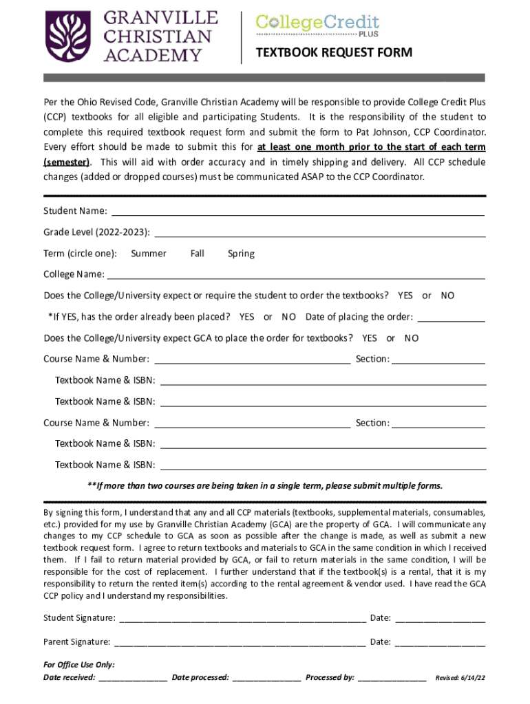 TEXTBOOK REQUEST FORM ___ ___Per the Ohio Revised Code, Granville Christian Academy will be responsible to provide College Credit Plus (CCP) textbooks for all eligible and participating Students.