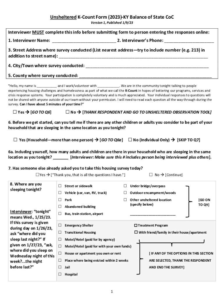 Sheltered Count Form (2023)KY Balance of State COC Version 1, Published 1/9/23Interviewer MUST complete this info before submitting form to person entering the responses online: 1. Interviewer Name: