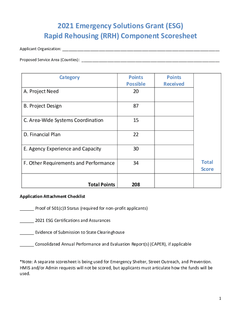 2021 Emergency Solutions Grant (ESG) Rapid Rehousing (RR) Component Scoresheet Applicant Organization: ___ Proposed Service Area (Counties): ___Category A. Project Endpoints Possible 20B. Project