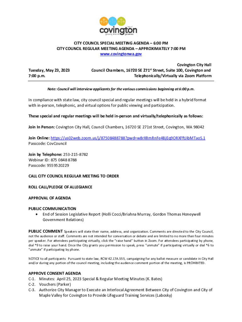 G CITY COUNCIL SPECIAL MEETING AGENDA 6:00 PM CITY COUNCIL REGULAR MEETING AGENDA APPROXIMATELY 7:00 PM www.covingtonwa.gov Tuesday, May 23, 2023 7:00 p.m. Covington City Hall Council Chambers, 16720