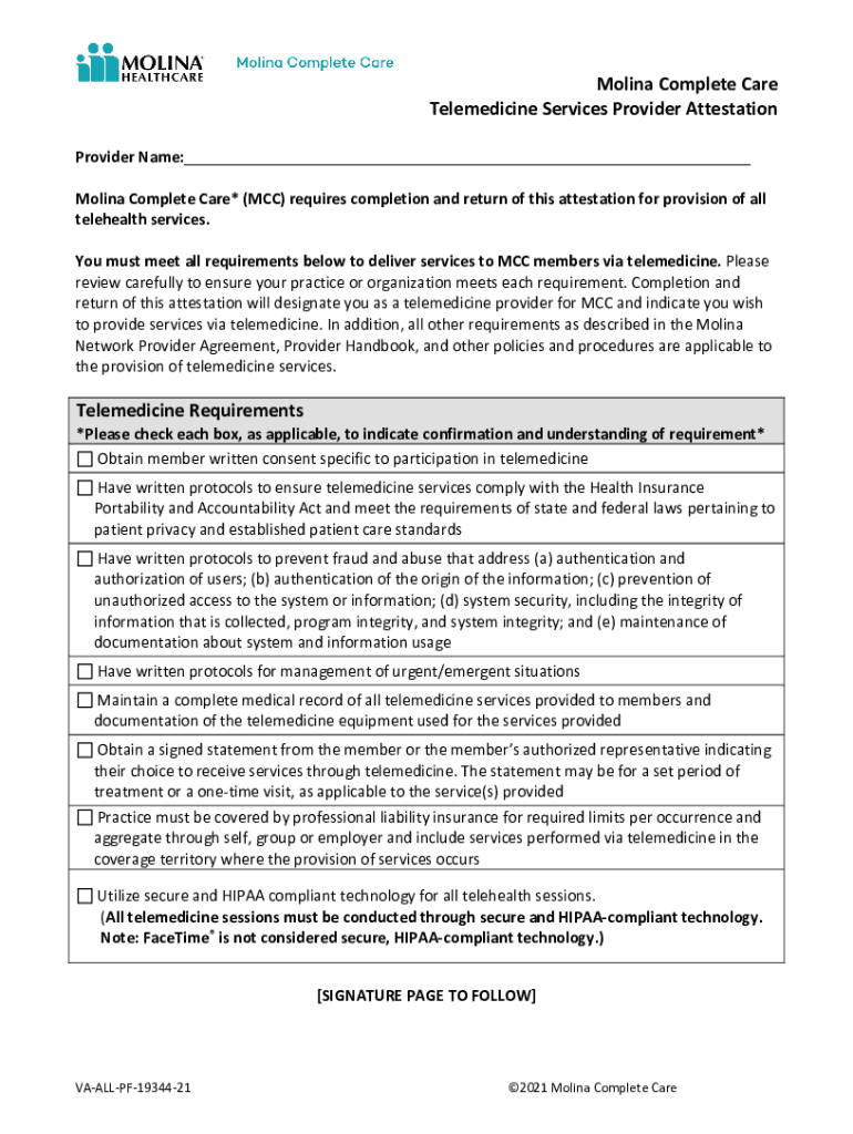 Molina Complete Care Telemedicine Services Provider Attestation Provider Name:___ Molina Complete Care* (MCC) requires completion and return of this attestation for provision of all telehealth services.