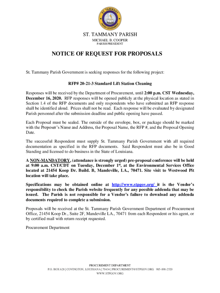ST. TAMMANY PARISH MICHAEL B. COOPER PARISH PRESIDENTNOTICE OF REQUEST FOR PROPOSALS St. Tammany Parish Government is seeking responses for the following project: RFP# 20213 Standard Lift Station