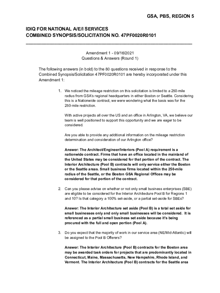 GSA, PBS, REGION 5 ID IQ FOR NATIONAL A/E/I Service COMBINED SYNOPSIS/SOLICITATION NO. 47PF0020R0101 ___ Amendment 1 09/16/2021 Questions & Answers (Round 1) The following answers (in bold) to the